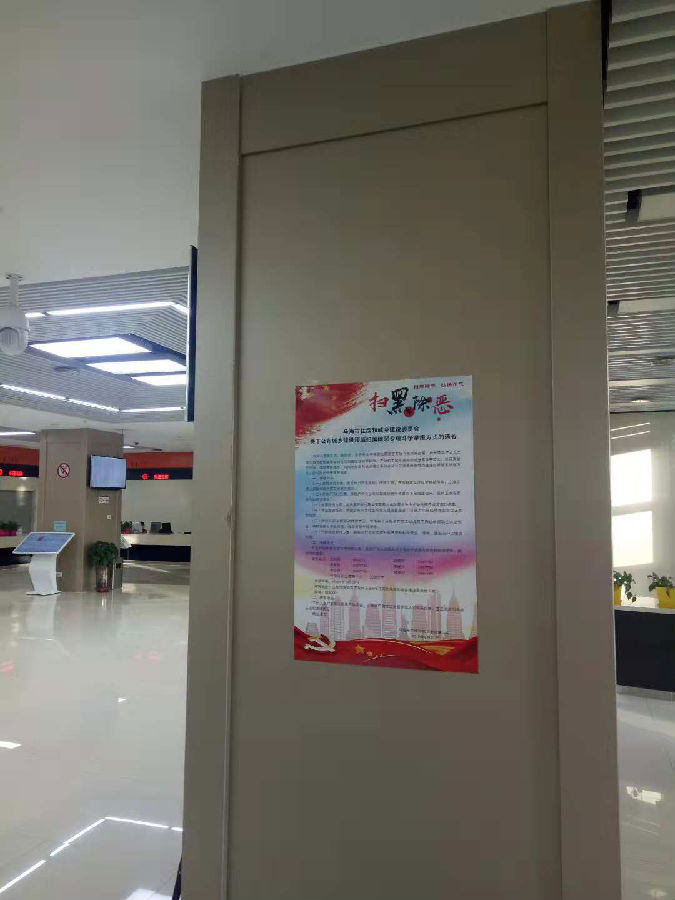 会后,督导组到中心大厅进行了现场察看,指出利用电子显示屏、横幅等相关宣传工具对扫黑除恶专项斗争进行宣传方面力度不够,氛围不浓。应该在办事大厅等群众集中的地方张贴关于扫黑除恶专项斗争线索举报联系电话,让群众对发现的情况能够及时反映,确保中心扫黑除恶专项斗争工作有效完成。